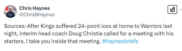 在那次赛后采访时,克里斯蒂没有特别提到与首发球员的会面,但他称球队在对阵勇士时的表现 “完全不可接受”。据蒙克说,国王队的教练明确表示,“我们不能再在家里被这样欺负了”。