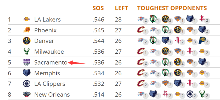 国王队目前在西部联盟仍处于附加赛的位置 —— 他们的战绩是28胜28负,在西部排名第十,领先排名第十一的太阳队1.5个胜场。但在上个赛季赢下了一场附加赛并输掉了第二场之后,他们知道从这个位置获得季后赛席位是多么具有挑战性,他们希望在赛季结束前在排名上有所提升。根据Tankathon的数据,国王余下赛程的难度在全联盟排名第五(注:排名越靠前越难),太阳排名第二,湖人高居第一。
